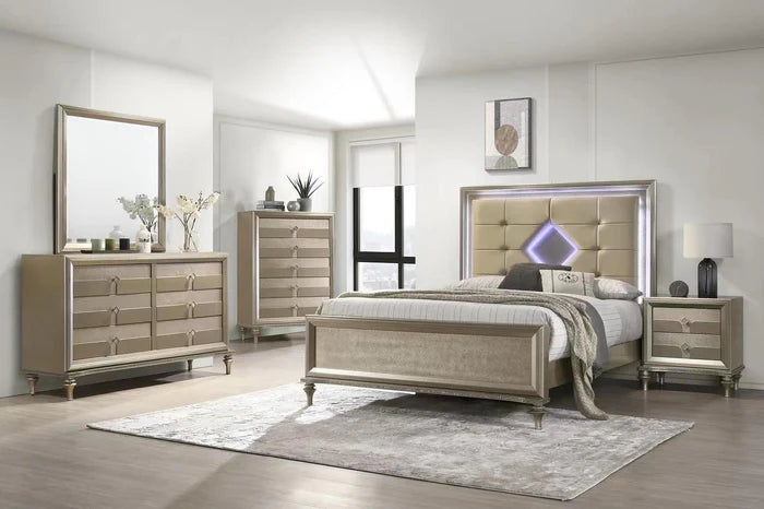 Experience unparalleled elegance with the BR2216 6-piece bedroom set featuring distinctive diamond-shaped design elements. This comprehensive collection includes a bed, dresser, mirror, and nightstand, all enhanced with integrated LED lighting for ambient illumination. Meticulously crafted to transform your bedroom into a sophisticated sanctuary, this luxurious ensemble combines contemporary aesthetics with practical functionality.